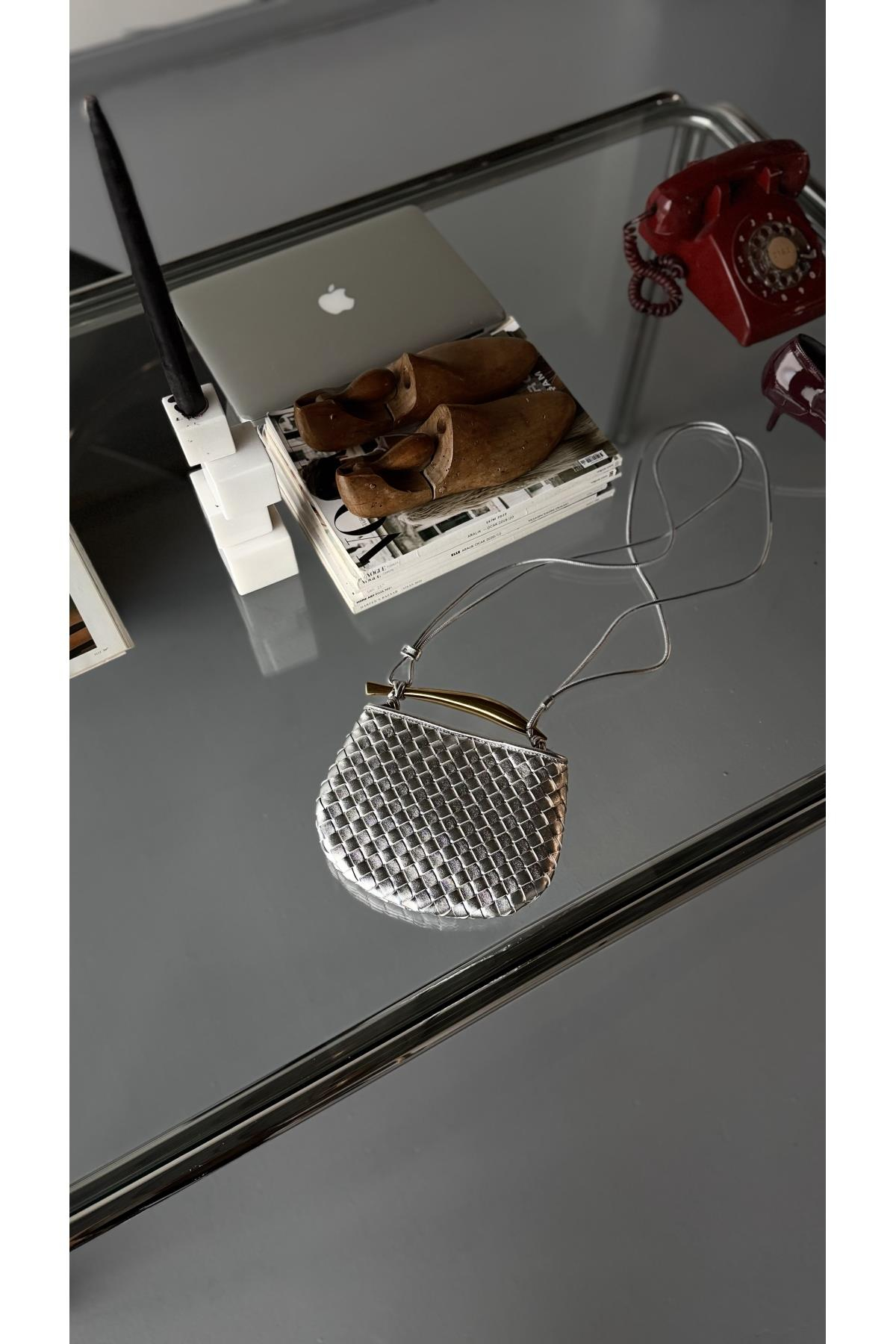 Botde Gümüş El Örgüsü Gold Metal Aksamlı Yandan Askılı Çanta