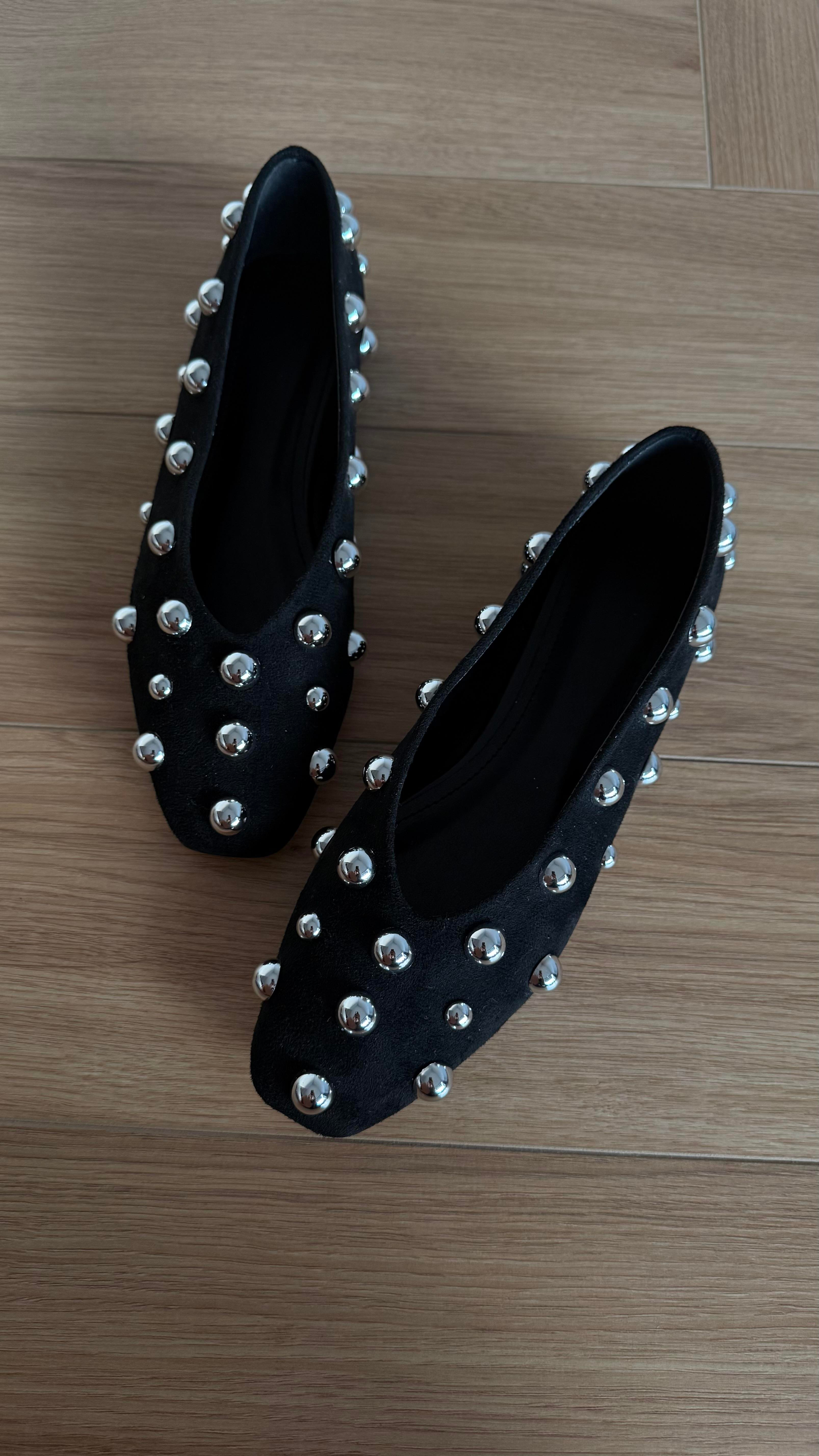 Kadife Siyah Kare Kalıp Gümüş Yuvarlak Toka Aksesuarlı Babet