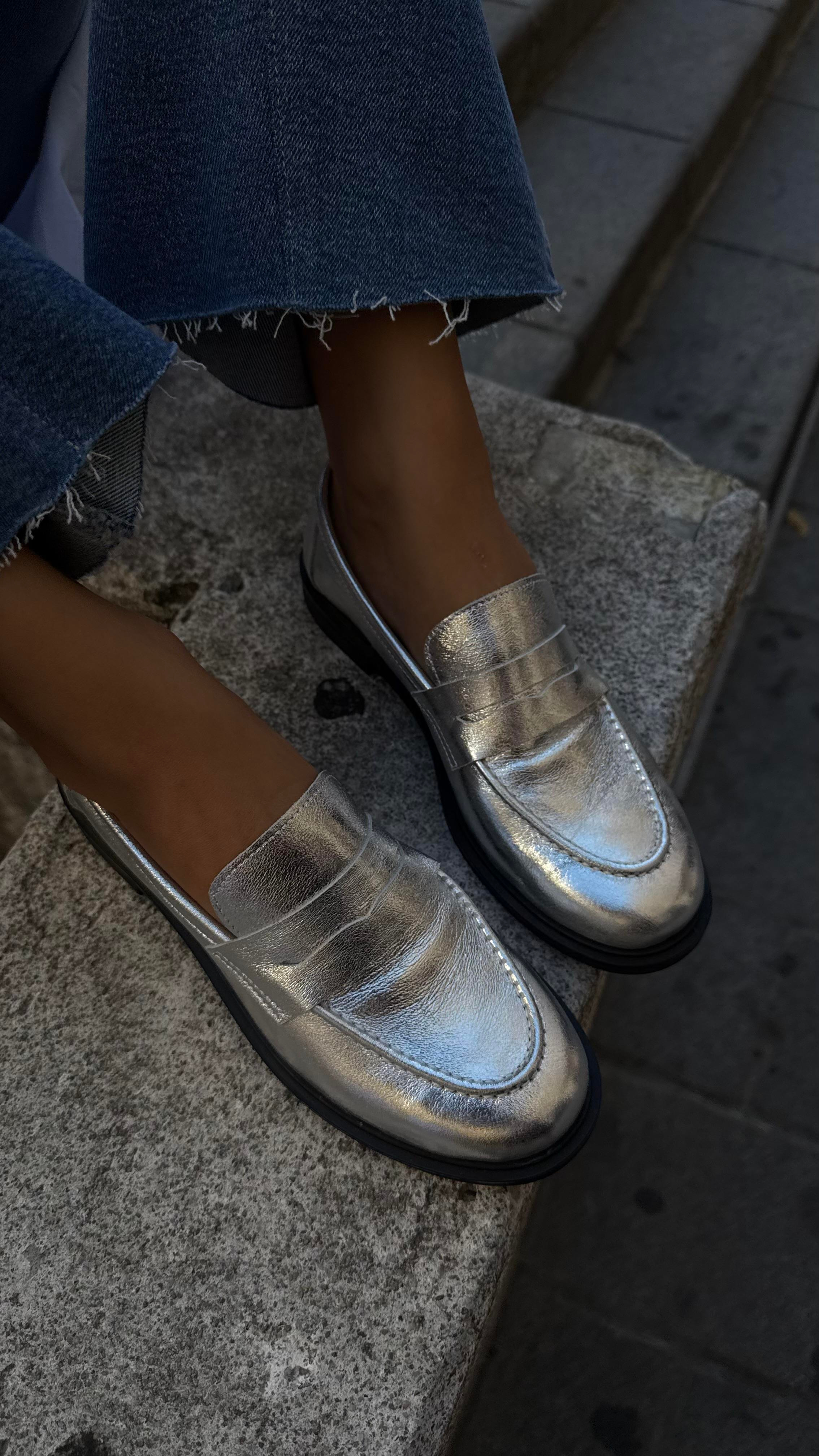 Kadın Düz Gerçek Deri Oxford Loafer Günlük Ayakkabı Gümüş