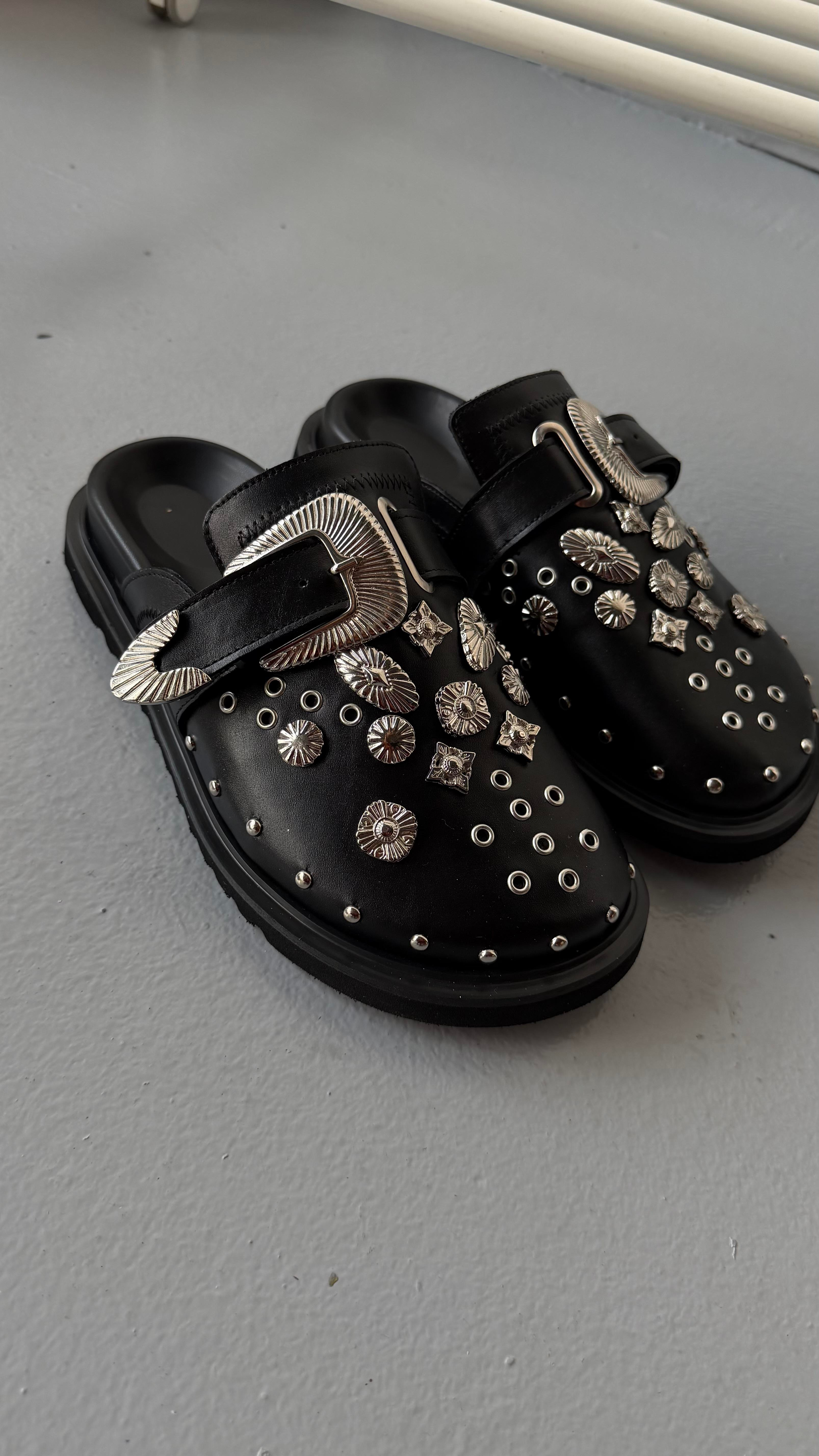 Siyah Cilt Hakiki Deri Kemerli Tokalı Burnu Kapalı Kadın Terlik